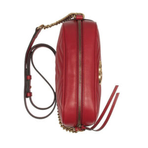 The Gucci GG Marmont Small Shoulder Bag is a bold statement piece with a vibrant red hue, designed to add a pop of color and elegance to any outfit.